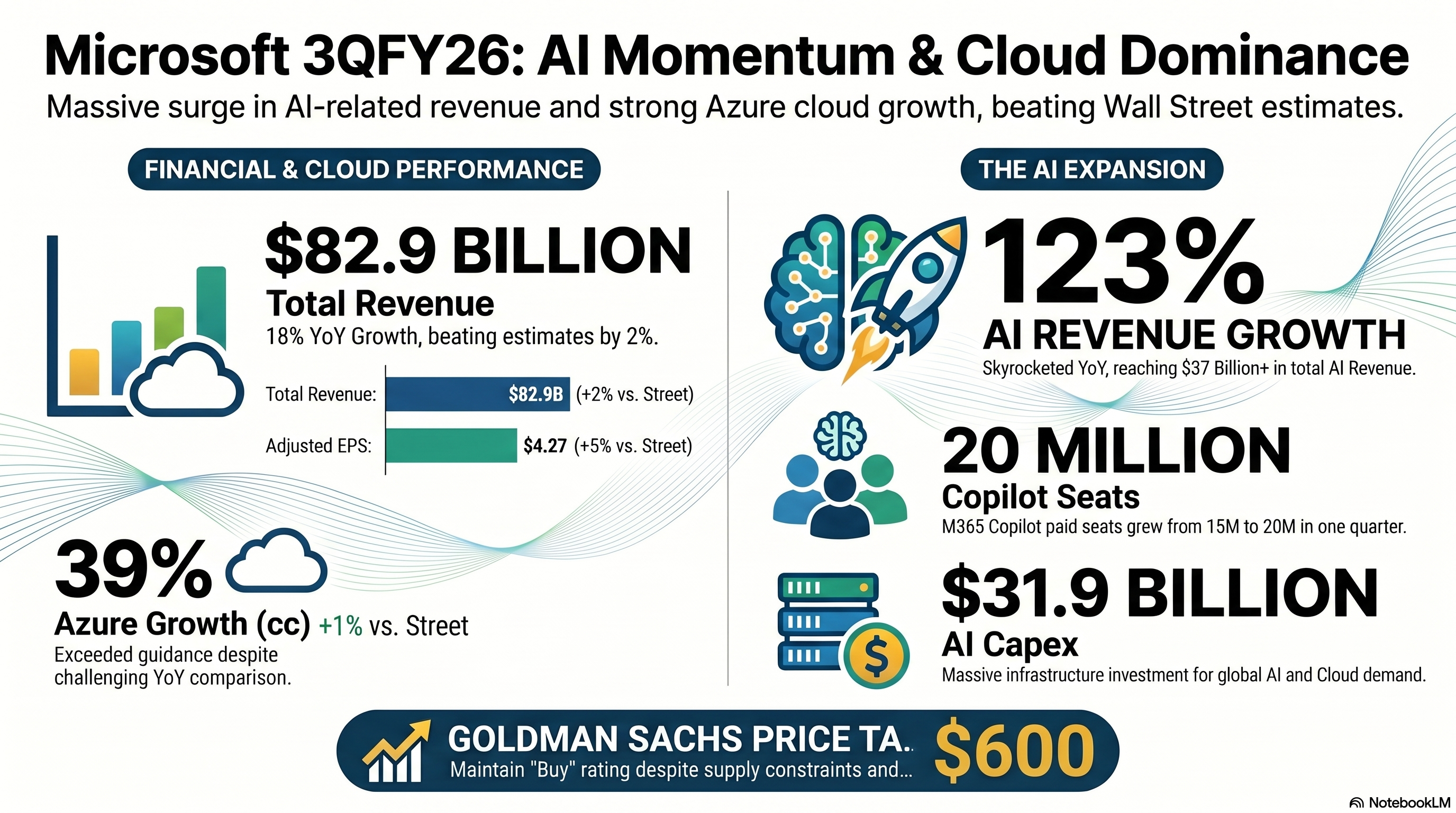 Total AI revenue $37B+, +123% YoY; Copilot paid seats topped 20M (from 15M last quarter)