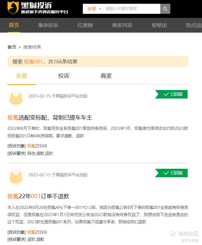 根據黑貓投訴平臺顯示,截至3月1日,“極氪001”因涉嫌虛假宣傳欺詐消費者、訂單不退款、誘導客戶下單等問題,投訴量166件,位居投訴前列。