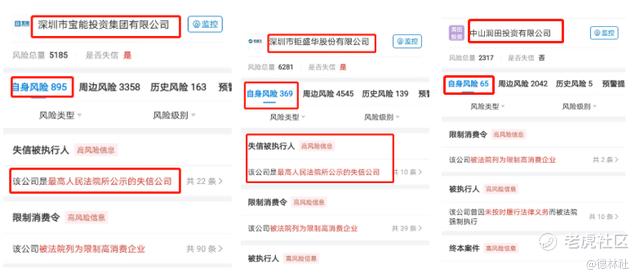 天眼查顯示,寶能集團(自身風險895條)、矩盛華(自身風險369條)、華利通(自身風險21條)、中山潤田(自身風險65條)存在被相關法院列爲被執行人情況,甚至是失信被執行人。