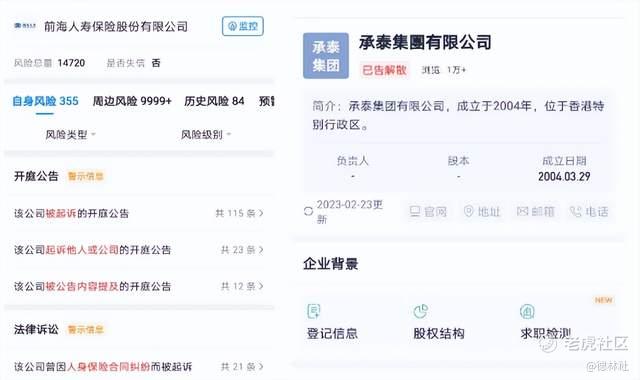 前海人壽(自身風險355條)訴訟衆多,承泰集團在天眼查上顯示已經解散,是否與寶能系承泰集團是同一家公司暫不清楚。