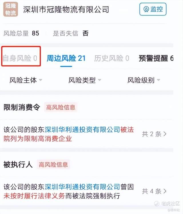 冠隆物流這家公司,互聯網上能檢索到的信息極少,可謂名不見經傳。天眼查顯示,冠隆物流的自身風險爲0,周邊風險21條,源於其股東華利通。