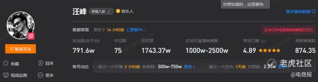 相關數據顯示,截止至10月20日,汪峯已經進行了8次直播,近30日的直播銷售額達到2500萬,在8月29日的直播當中還曾登上帶貨榜第一名。