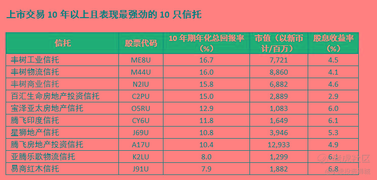 上市超過10年且表現最強勁的10只新加坡房託(S-REIT)和地產商業信託錄得12.5%的10年平均年化總回報率。從10年的絕對值來看,這10只信託的平均總回報率達240%,REIT依然是投資者的首選長線資產類別。
