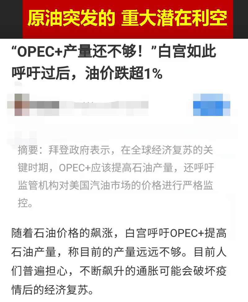 週四晚的直播給大家強調過,原油突發了一個重大潛在風險,就是美國白宮喊話OPEC+加快增產來滿足市場,儘管很快被闢謠且被OPEC懟回去,但空穴來風並非無因。