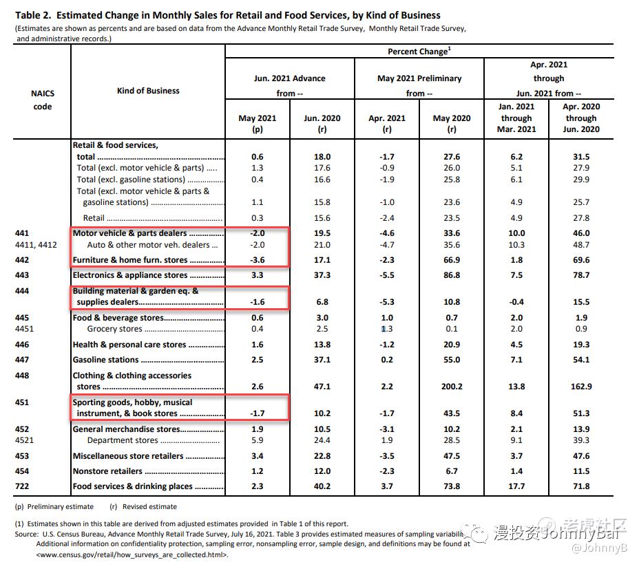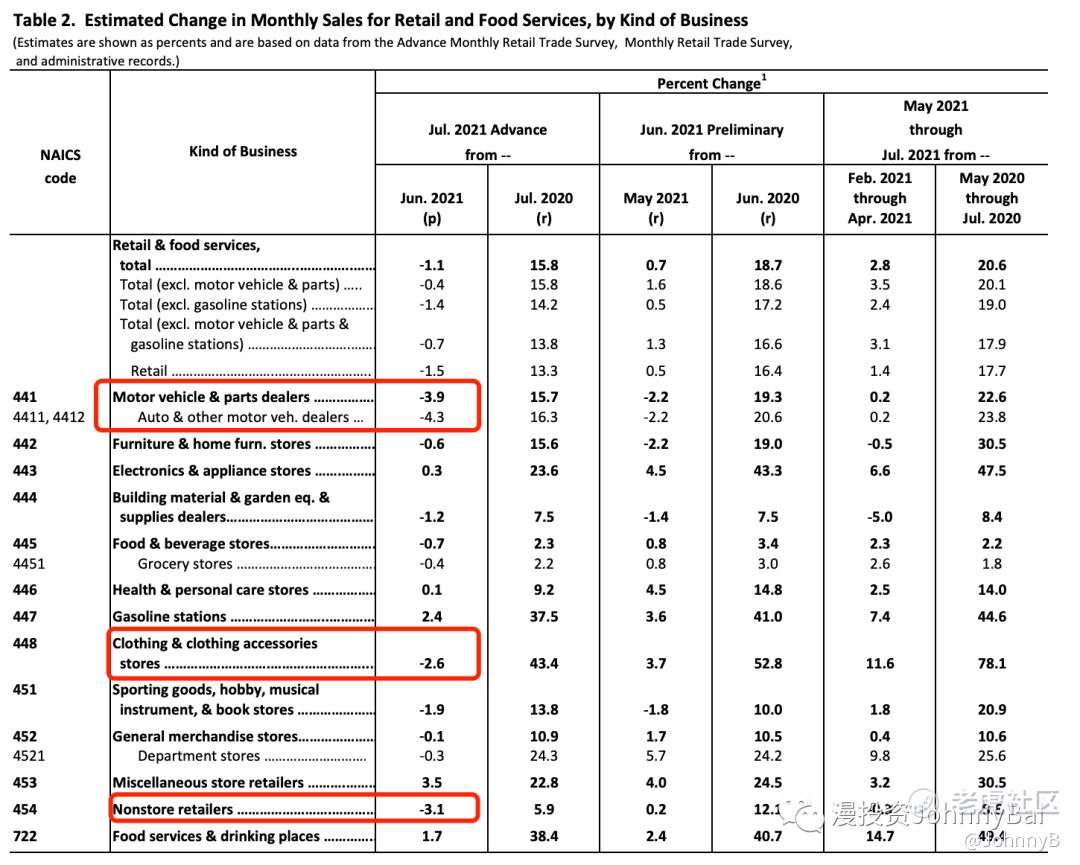 Delta疫情的影響慢慢體現出來了,疫情紓困金沒了,聯邦的300元失業補助金也慢慢沒了,現在工作也不是,不工作也不是,但地主家也沒有餘糧了,哪有錢消費呢,從消費類別來看,影響大頭是汽車,服裝,和非商店零售(在線)。汽車因爲芯片短缺價格一直很高,打退了人們的消費慾望,最近幾個月銷售都在下降。6月有Amazon的Primary Day,估計老美和國內也差不多,趁着促銷打折買不少東西,大類服裝肯定少不了,所以7月服裝和在線消費都少了唄,但是亞麻就不知道淘寶雙十一後面還有個雙十二???就不會搞個返場??