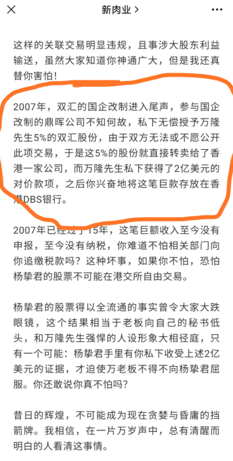 8月18日,雙匯發展的實際控制人 萬隆,被自己的長子萬洪建舉報涉嫌侵佔價值2億美金國有資產,同時還在這筆鉅款上偷稅漏稅。... ...