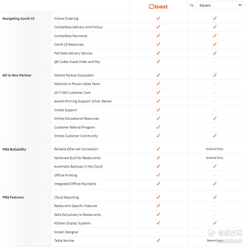 Toast列出了Square(SQ)、甲骨文(ORCL)和Heartland支付系統等競爭對手。雖然這些公司包括大公司,但沒有一家公司提供專門爲餐廳設計的完整的端到端軟件平臺。