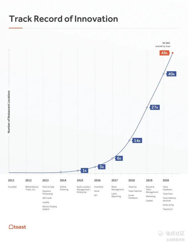 我們來看第一家公司,Toast, 代號 TOST,創立於2011年,爲在美國和其他國家提供餐廳支付和管理軟件。該平臺可以取代之前在支付、訂購、發票和運營方面拼湊的傳統技術解決方案。