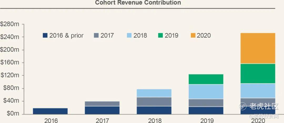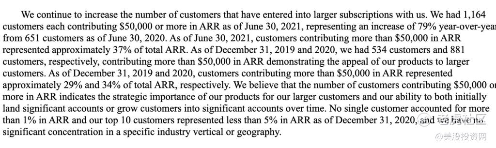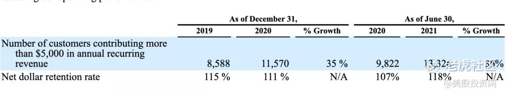 到 2020 年 6 月 31 日,Freshworks 有約 44000 個客戶,現在有 52500 個客戶,客戶數量在一年內增長了 20%, ARR 增長了 49%。值得注意的是,與 Zoom 的模式一樣,Freshworks不用強制要求客戶按年訂閱,也可以按月訂閱。從 2019 年的 54%上升到每年 62% ,這是一個很大的推動。但仍然有 38% 的 Freshworks 客戶按月付費。