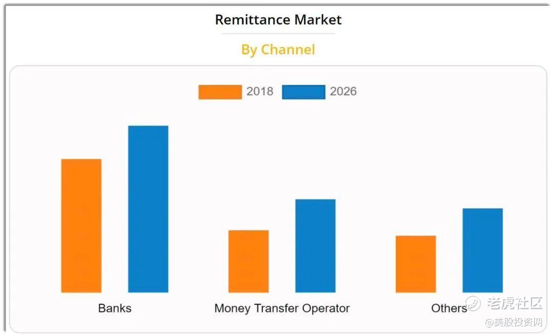 根據聯合市場研究公司的市場研究報告,2018年全球匯款市場規模估計爲6830億美元,預計到2026年將達到9300億美元。這意味着從2019年到2026年,CAGR預測爲3.9%。這一預期增長的主要驅動因素是人口遷移的增加和商業匯款的增長,以及更多生產出口商品和服務的企業。此外,下面的圖表表明,至少到2026年,銀行部門將繼續主導全球匯款市場: