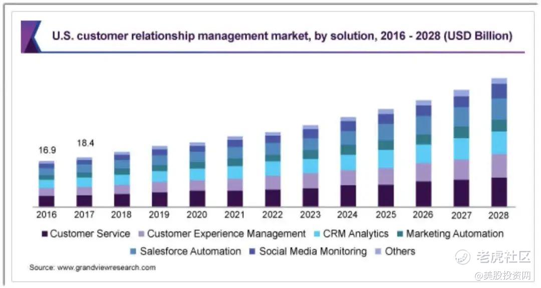 根據Grand View research的2021年市場研究報告,2020年全球客戶關係管理市場規模估計爲437億美元,預計到2028年將達到980億美元。這意味着2021年至2028年的複合年增長率預測爲10.6%。對於一個已經很大的行業來說,這是一個強勁的增長率。這種預期增長的主要驅動因素是對集成軟件套件的不斷增長的需求,這些軟件套件可以自動與客戶和潛在客戶進行溝通。