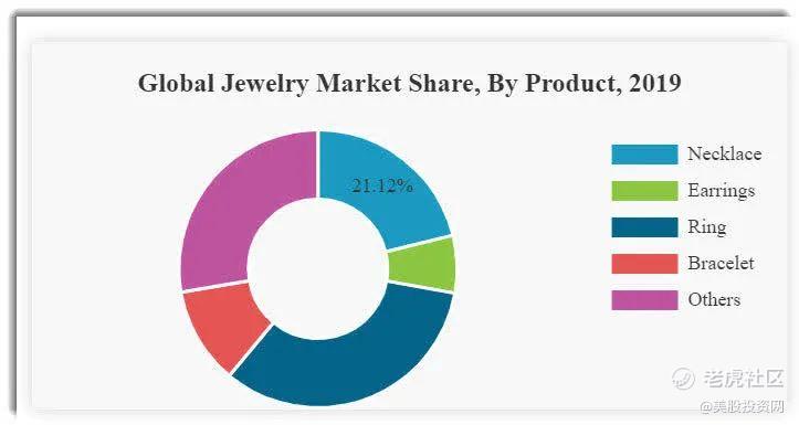這是一個餅狀圖,顯示了2019年各珠寶類型的大致市場份額: