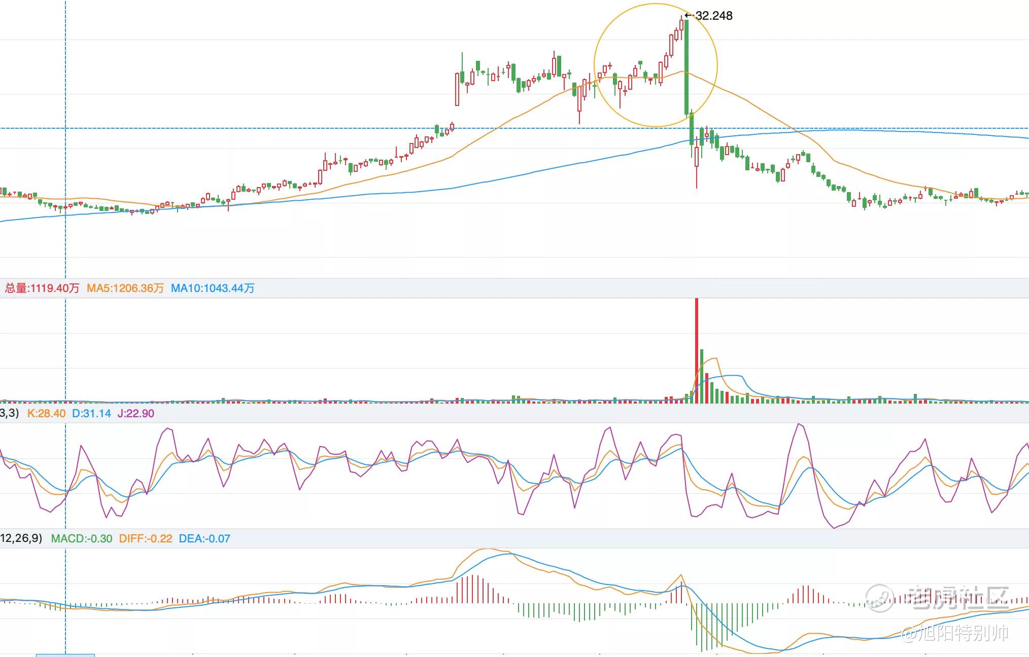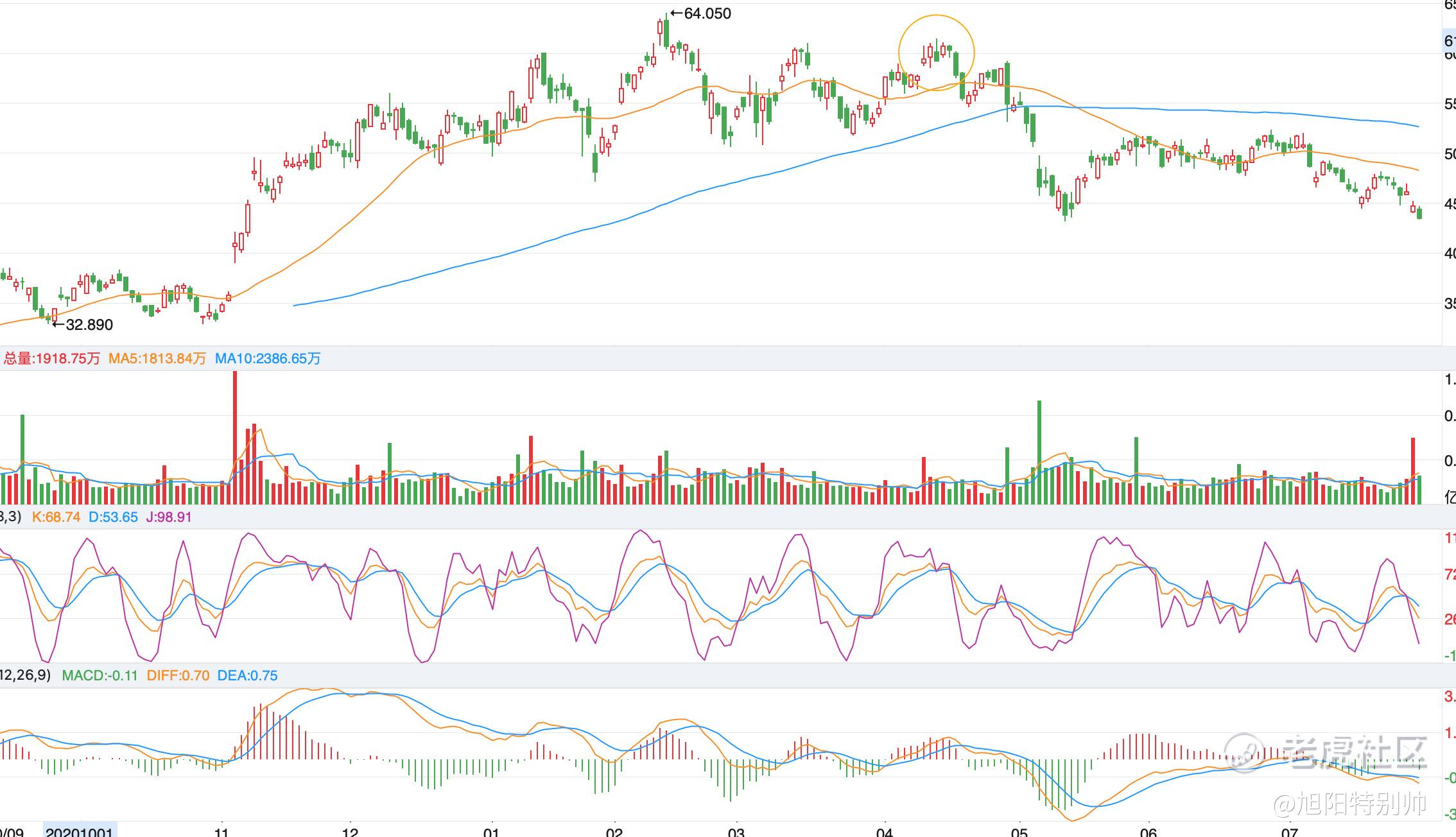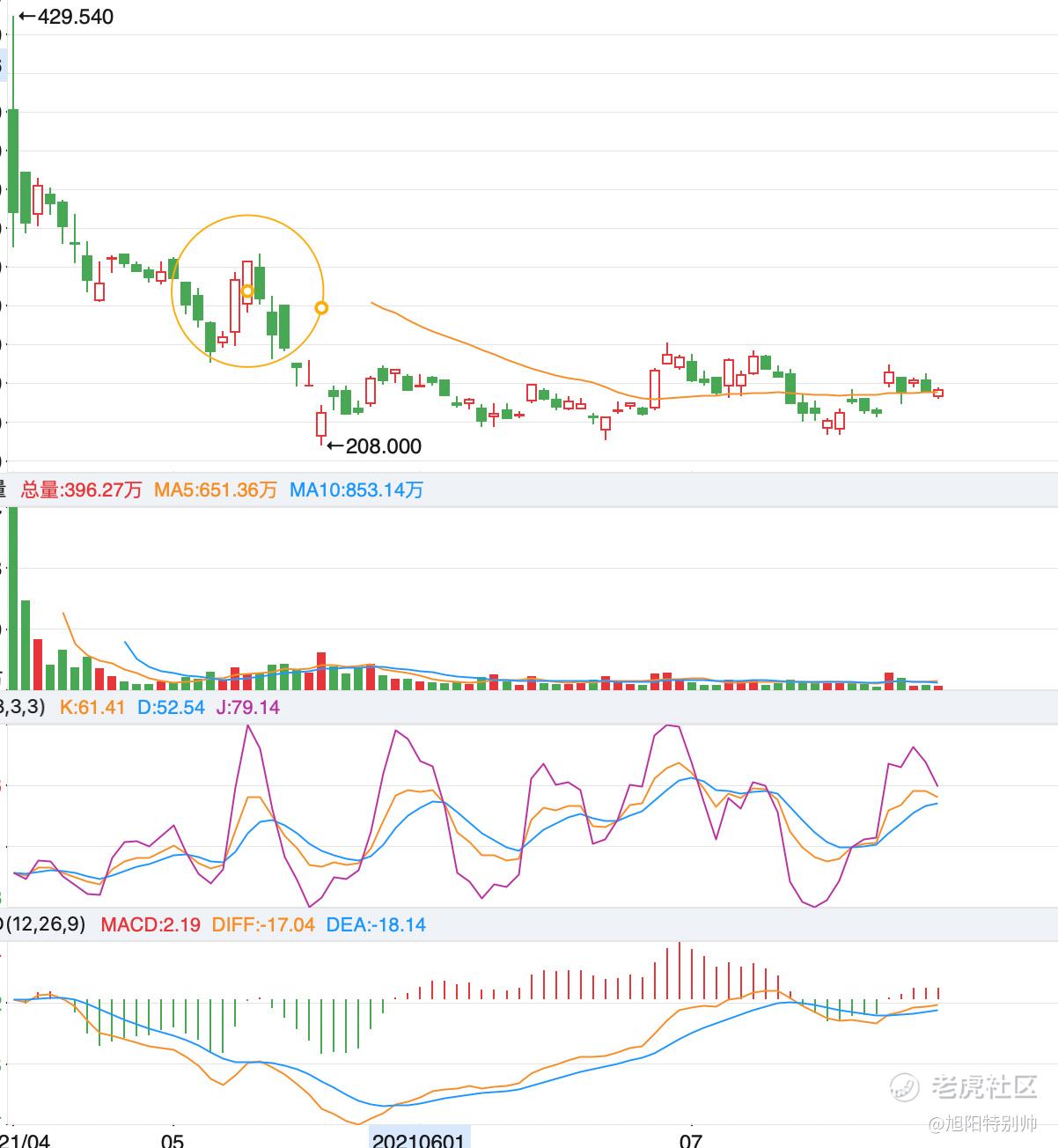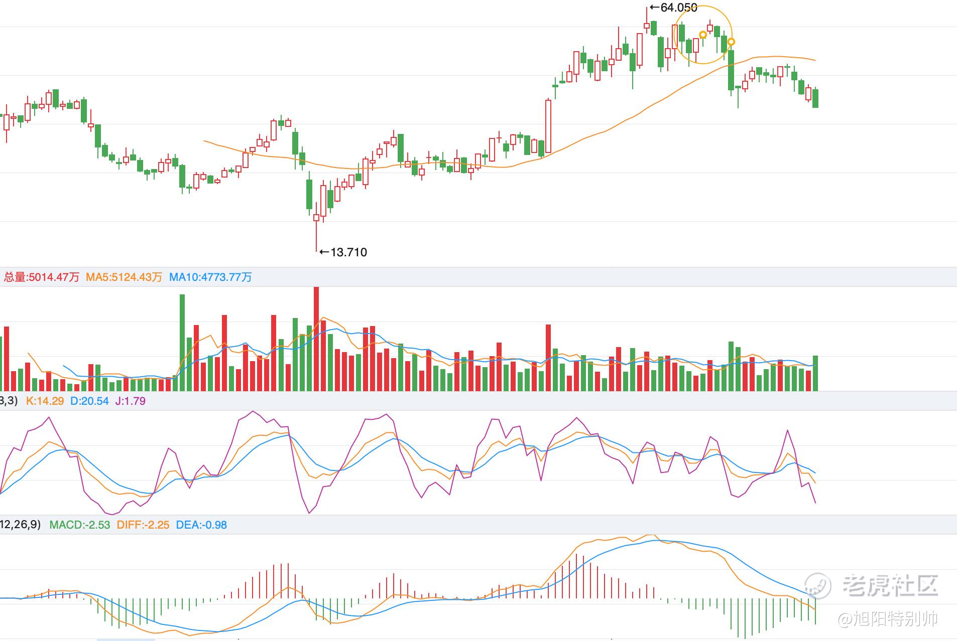 筆者進去操作之前,富途就漲的很歡,跟美股大盤的走勢同步。但天下沒有不散的宴席,筆者也是犯了一個同樣的錯誤。從周線看,周線MACD將死叉,動能已經衰竭。但筆者依然抱着僥倖心理,高位接盤,以爲美股會強勢到不顧技術分析,時候當然證明是我天真。不過日線上卻是一副要漲的做派,讀者可以自己看,強勢盤整,日線kdj和macd都到位,筆者忽略了整體趨勢。-2600。