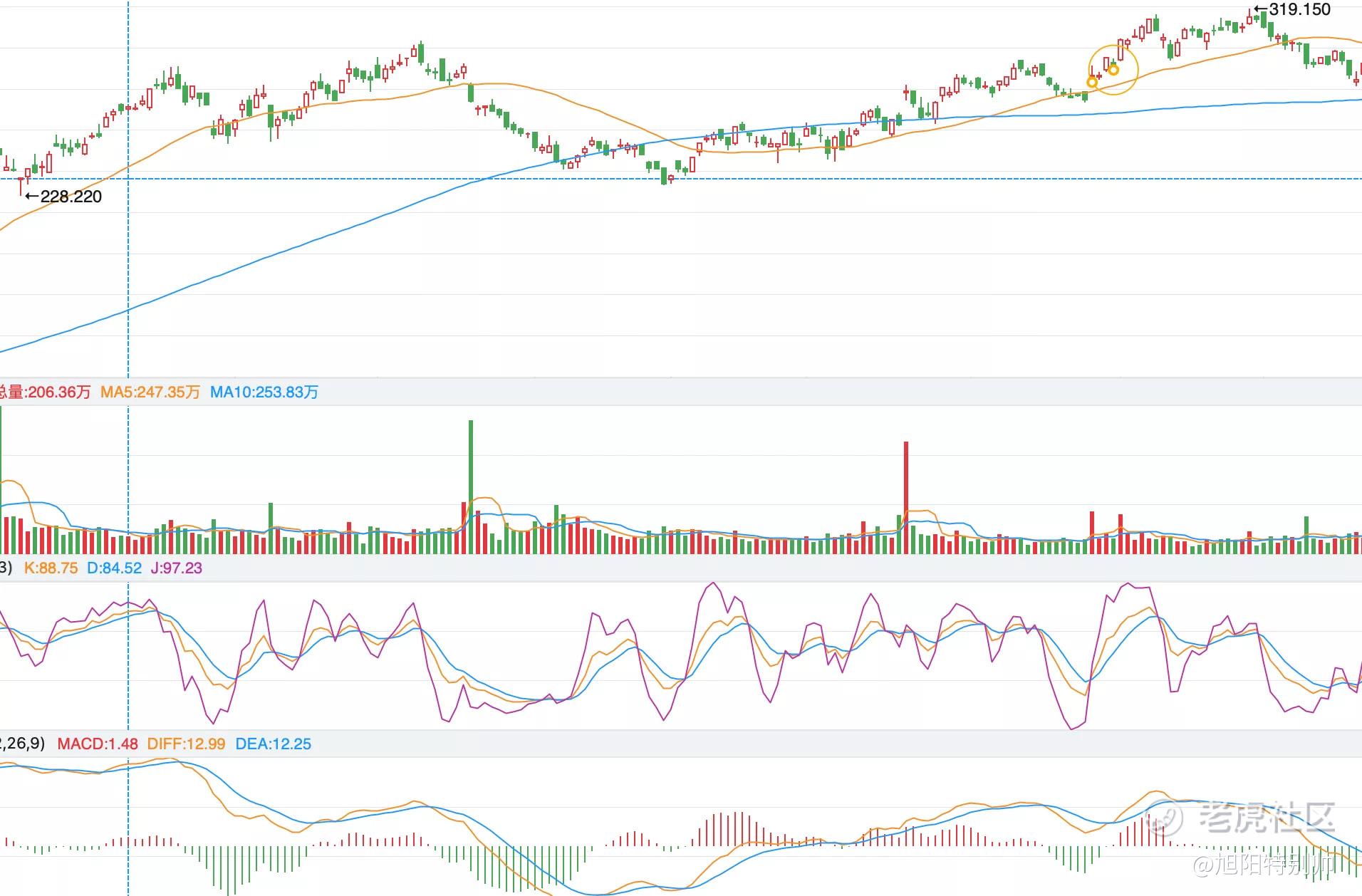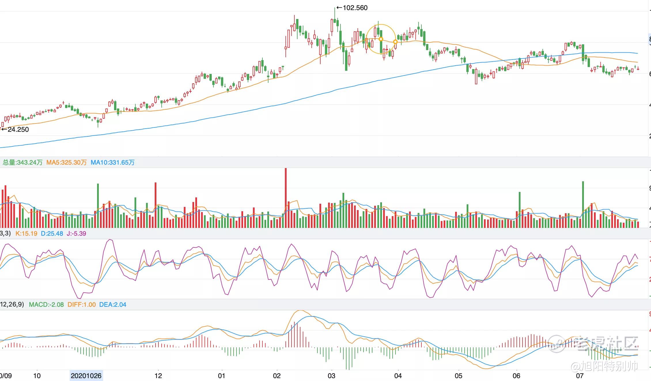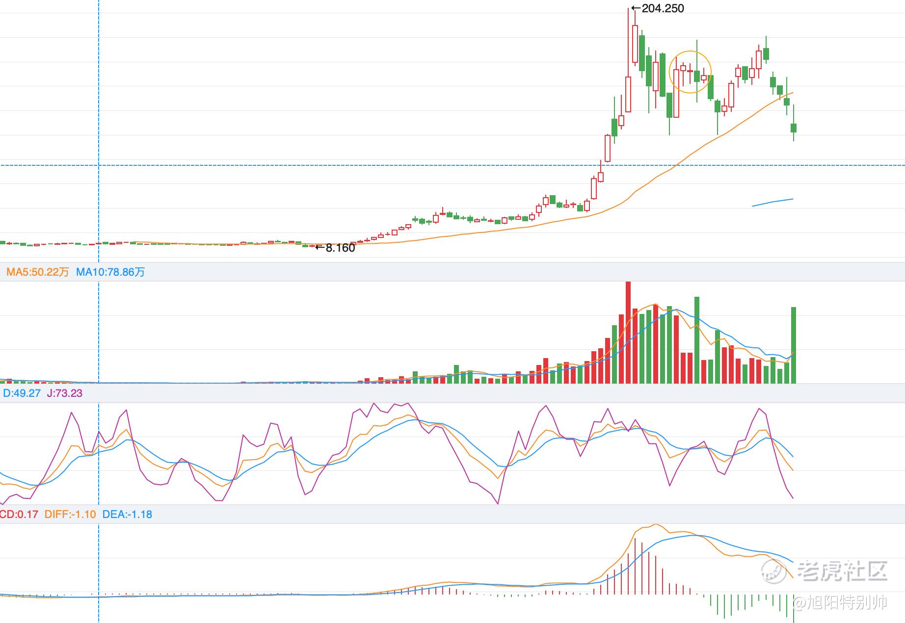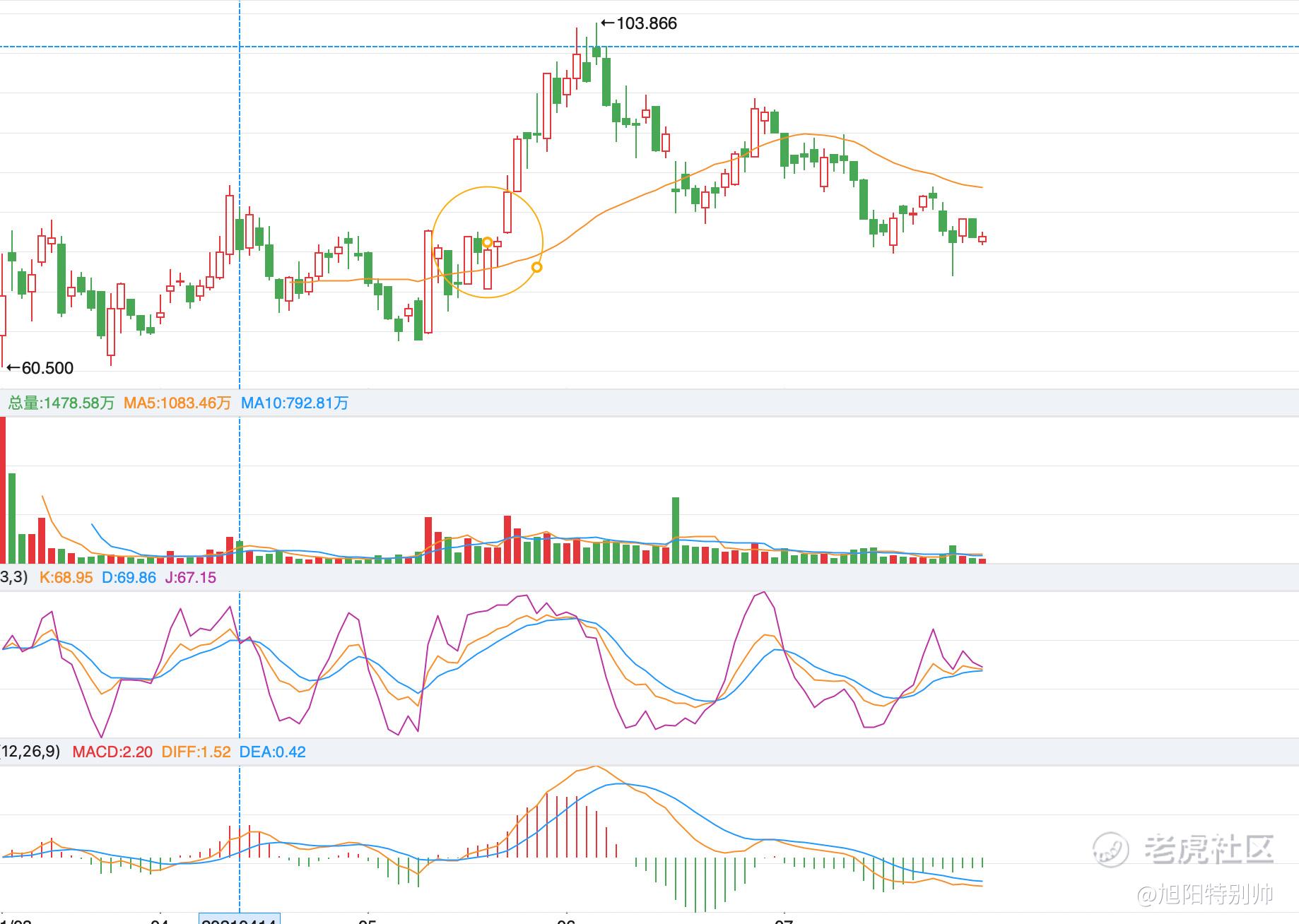 筆者進去操作之前,富途就漲的很歡,跟美股大盤的走勢同步。但天下沒有不散的宴席,筆者也是犯了一個同樣的錯誤。從周線看,周線MACD將死叉,動能已經衰竭。但筆者依然抱着僥倖心理,高位接盤,以爲美股會強勢到不顧技術分析,時候當然證明是我天真。不過日線上卻是一副要漲的做派,讀者可以自己看,強勢盤整,日線kdj和macd都到位,筆者忽略了整體趨勢。-2600。
