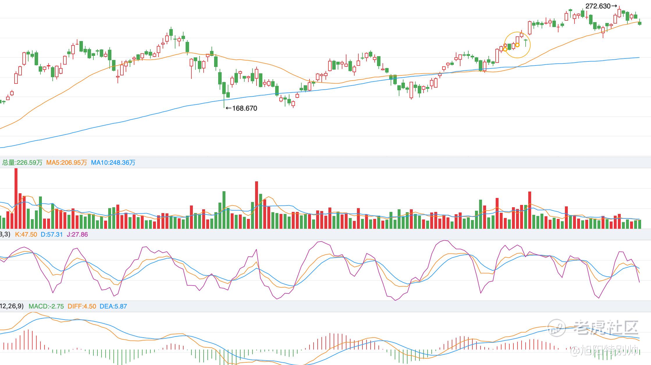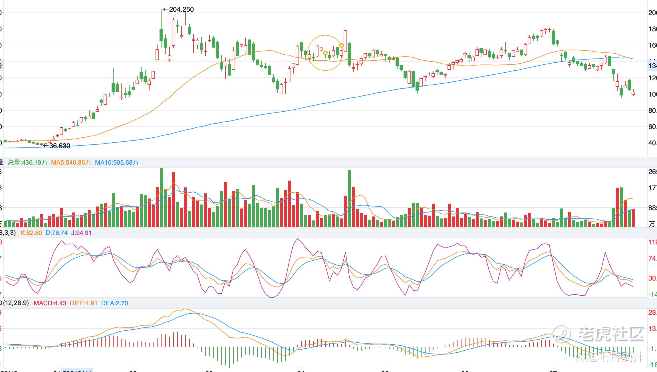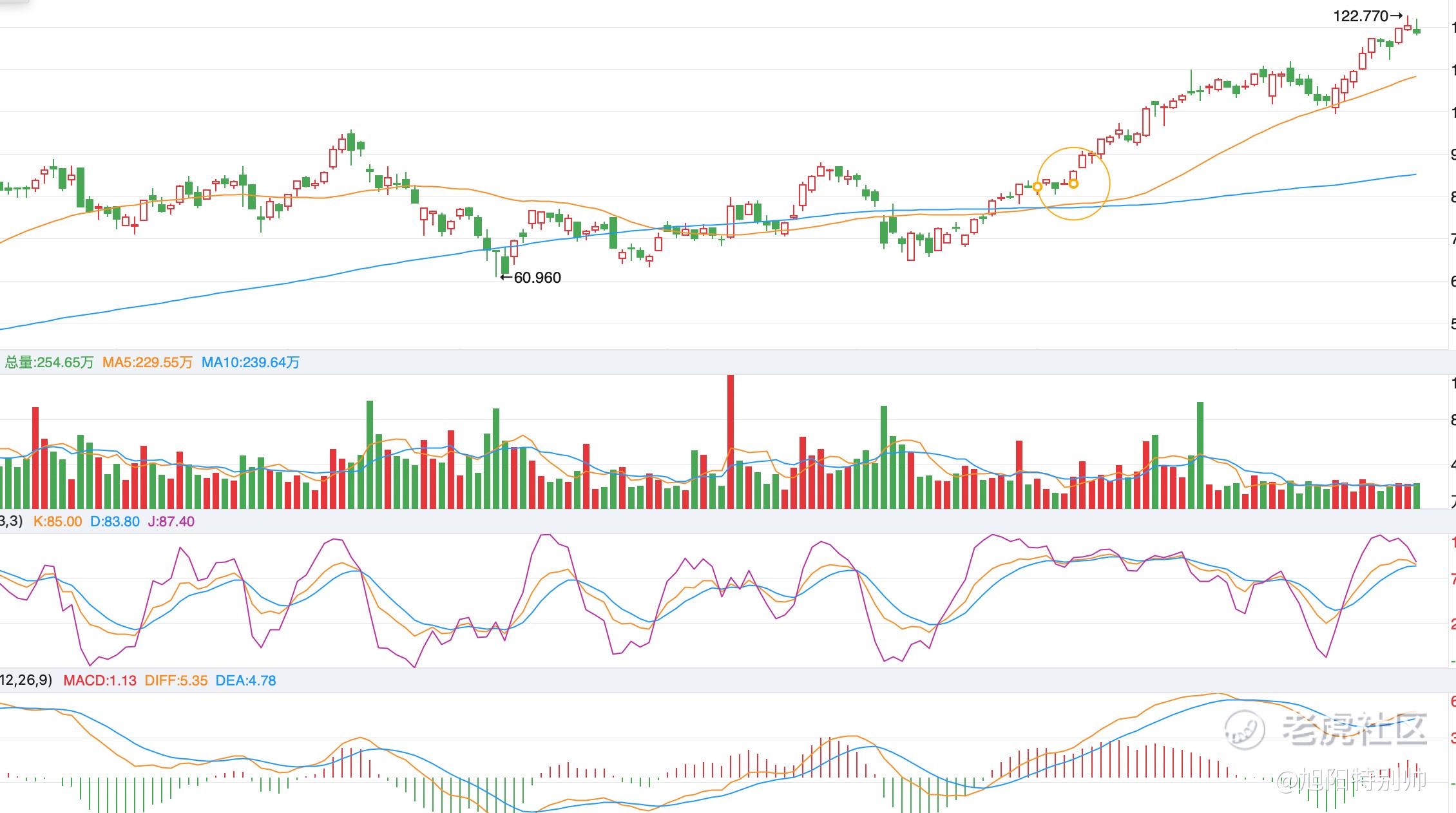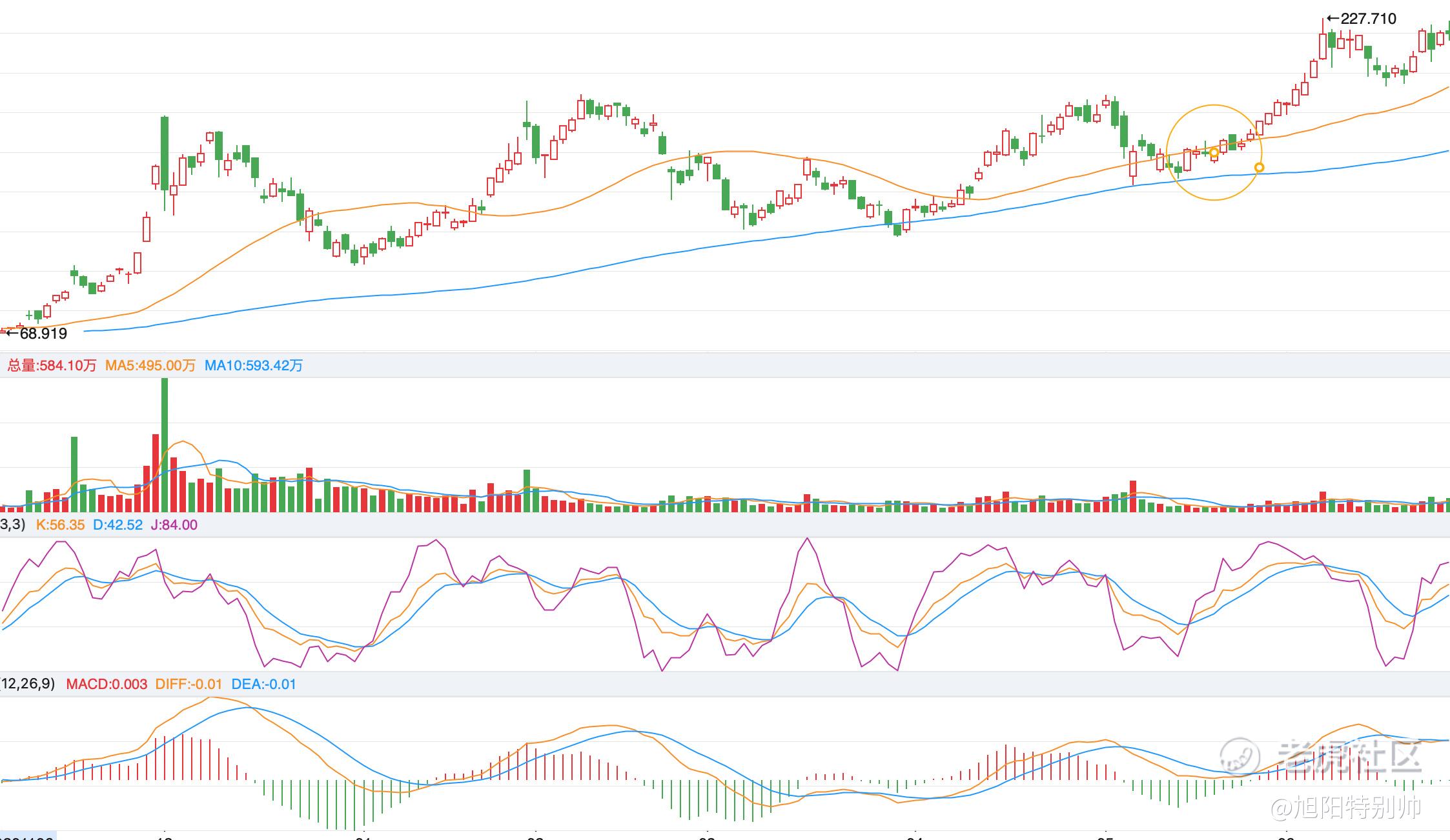 筆者進去操作之前,富途就漲的很歡,跟美股大盤的走勢同步。但天下沒有不散的宴席,筆者也是犯了一個同樣的錯誤。從周線看,周線MACD將死叉,動能已經衰竭。但筆者依然抱着僥倖心理,高位接盤,以爲美股會強勢到不顧技術分析,時候當然證明是我天真。不過日線上卻是一副要漲的做派,讀者可以自己看,強勢盤整,日線kdj和macd都到位,筆者忽略了整體趨勢。-2600。