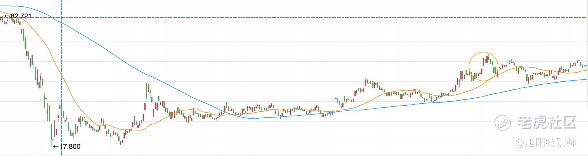 畫圈的地方是交易點。航空股由於疫情原因,跌的不成樣子。但由於疫苗的推行,美國經濟開始復甦,人們對於航空業重啓充滿了希望。UAL在去年疫情下暴跌,基本是沒遇上什麼支撐點,下跌的狀態像是瀑布。筆者的買入點在21年3月15日,這個位置UAL剛好突破了前期高點,同時那段時間道瓊斯指數比納斯達克強勢,UAL還順勢做了一個回踩動作,確認了支撐力。在橫盤了幾天後拉了陽線。上面沒有阻力,筆者進場,第二天UAL大漲8.26%。