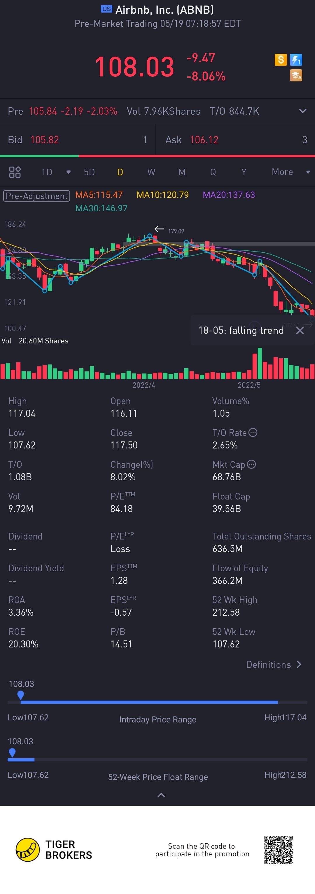 $Airbnb, Inc.(ABNB)$after great earnings and forcasts.... dropping close to 50 percent for air bnb is just madness especially with the summer season on the horizon, their earmijgs will explode.... the market way iver sold and not inline with fundsmentals. Keep buying under valued stocks.