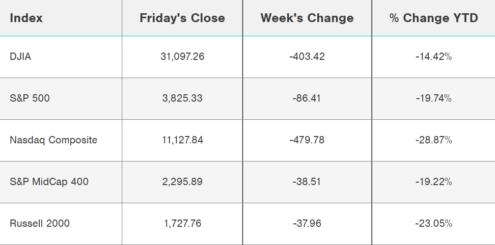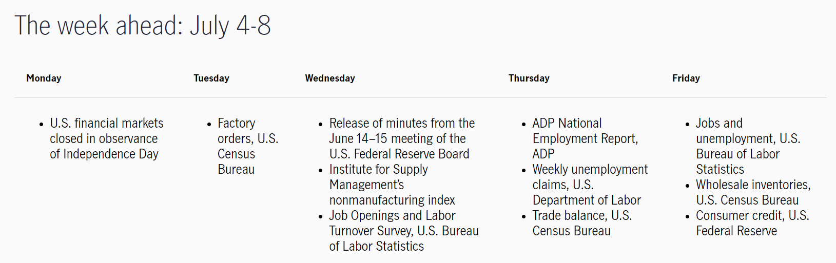 - The major indexes surrendered a portion of the previous week’s strong gains, as worries grew that the Federal Reserve’s fight against inflation would push the economy into recession. The S&P 500 Index closed out its worst first half of the year since 1970, as was widely reported, although the decline was amplified by the index reaching its all-time high on January 3. Typically defensive segments within the index, such as utilities and consumer staples, held up best, while consumer discretionary and information technology shares were particularly weak. Markets were slated to be closed on Monday, July 4, in observance of the Independence Day holiday.