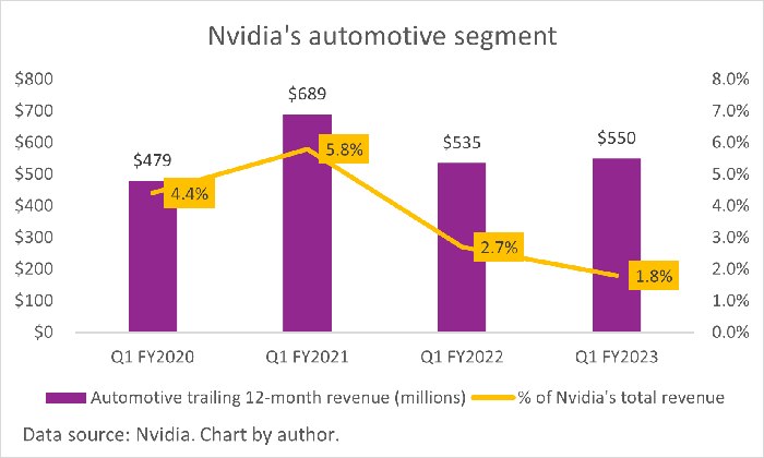 But Nvidia's smallest segment -- automotive and robotics -- is arguably the most exciting. It's a tiny piece of the company's overall business, making up just 1.8% of its total revenue over the last 12 months, but that has real potential to change.