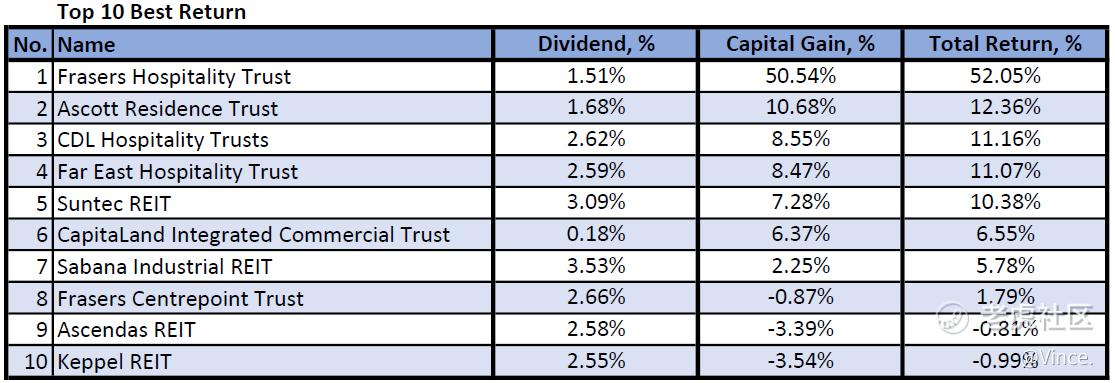 The top 4 highest returns come from hospitality trusts. Frasers hospitality trust has a significantly high return due to the proposed privatization offer @ 70 cents. There are only 8 counters that have positive YTD total returns while 6 counters out of 10 are MACFK counters.