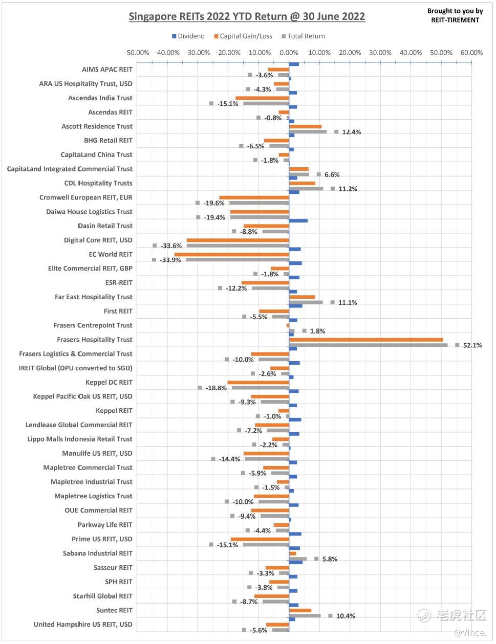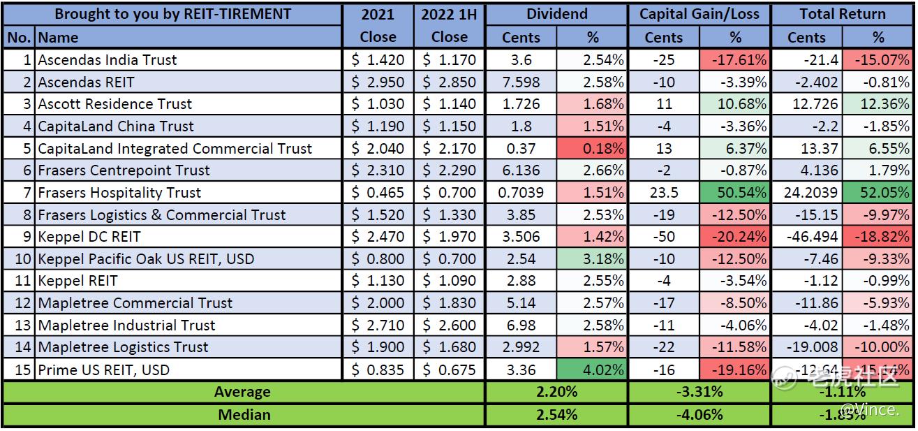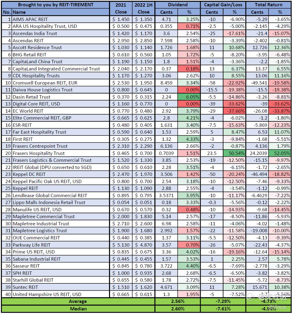 Below is the infographic for returns of Singapore REITs as of 1H 2022, including Business Trusts - Ascendas India Trust & Dasin Retail Trust. Note that the dividend is based on the ex-dividend date. ARA LOGOS Logistics Trust and Mapletree North Asia Commercial Trust have been removed from the list.