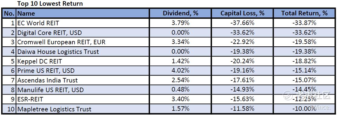 2 pure data centre REITs and 3 pure logistics REITs are in the top 10 lowest returns. 4 out of 10 are from MACFK counters.