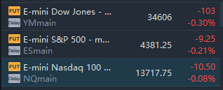 At 7:50 a.m. ET, Dow e-minis were down 103 points, or 0.30%, S&P 500 e-minis were down 9.25 point, or 0.21%, and Nasdaq 100 e-minis were down 10.5 points, or 0.08%.