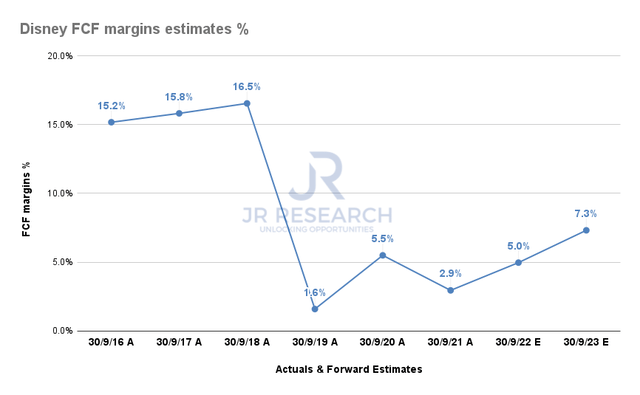 Hence, we think Disney investors need to contend with markedly lower FCF yields moving forward unless its DTC service can ramp its profitability significantly.