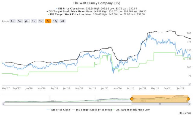 DIS stock consensus price targets Vs. stock performance (TIKR)