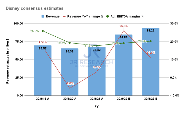 Consensus estimates suggest that Disney should be able to surpass its pre-COVID revenue in FY22. Disney is projected to post $84.86B in revenue, up 25.9% YoY. The gains from the recovery in its Park segment would be critical to Disney continuing to meet guidance. In addition, Disney's adjusted EBITDA margin is also expected to improve to 19.1%, from FY21's 17.7%.