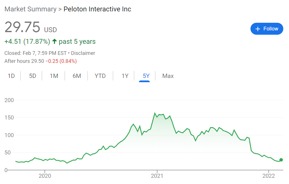In late January, after declining nearly 24% in one day. Rumors of a possible Peloton acquisition sent the stock soaring 21% today. Rumor has it that companies like Amazon, Apple, and Nike all have an interest in purchasing Peloton.