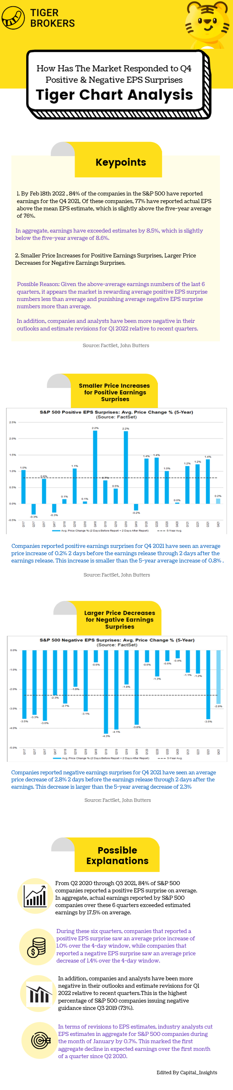 How has the market responded to positive EPS surprises and negative EPS surprises reported by S&P 500 companies during the Q4 earnings season? And Why the market show Smaller Price Increases for Positive Earnings Surprises and Larger Price Decreases for Negative Earnings Surprises.