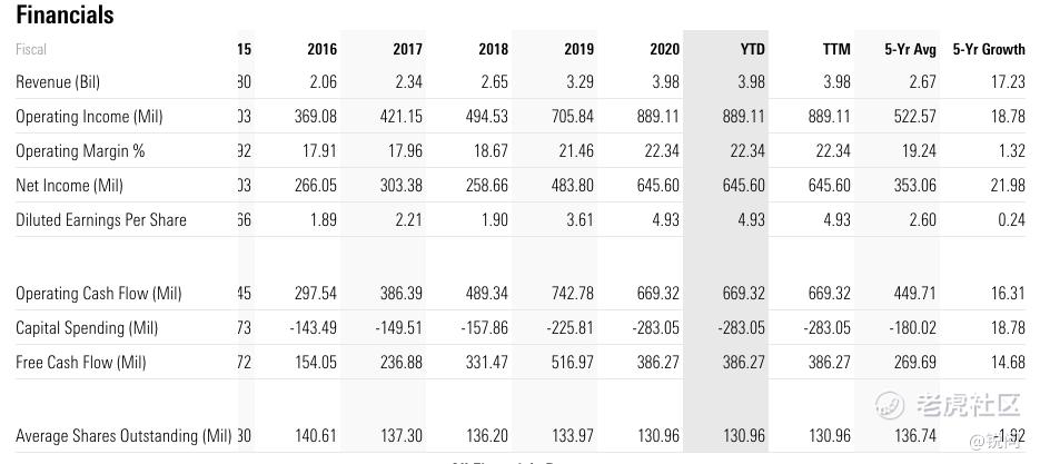 公司財務方面:收益每年都在增長。每股收益也翻了一倍的樣子,成長非常穩定、回報也非常良好。銷售增長了19.7%到達14億美金。流動比例在2.91,也就是說,即使公司遇到大的財務問題,他們也能非常快速地償還債務。很多零售商會有債務、存貨問題,但這家公司硬指標很強。