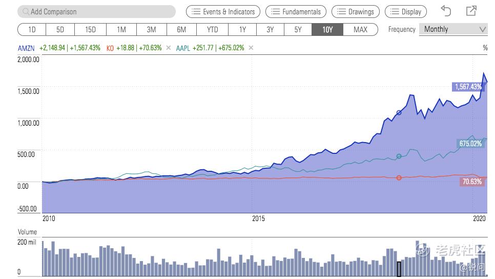 舉個例子:可口可樂和亞馬遜公司以及蘋果。以十年爲基礎做分析: