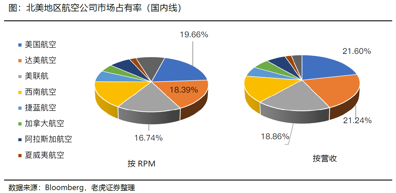 若按照客運里程收入(RPM)來算,美國國內線市場份額最大的爲美國航空,佔比19.66%。國際線佔有率基本爲美聯航、達美航空、美國航空所瓜分。