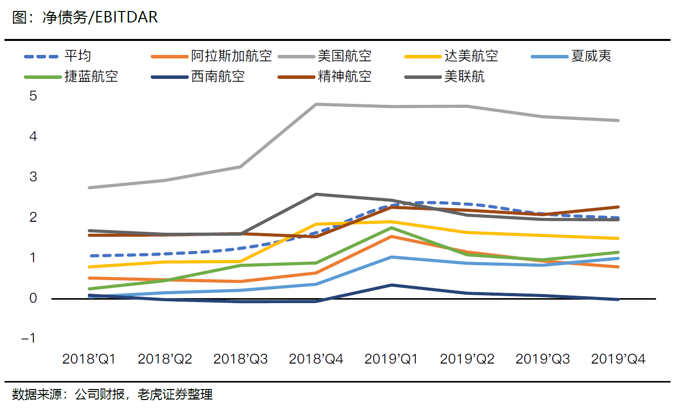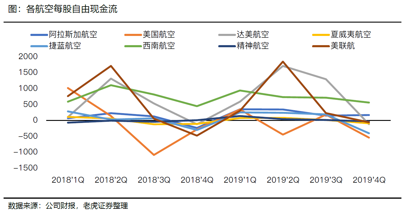 現金流方面,美國航空自2018年下半年以來的自由現金流就較差,大航司中達美航空的自由現金流燒好,但在19Q4也急速下滑。目前自有現金流最好的是西南航空。