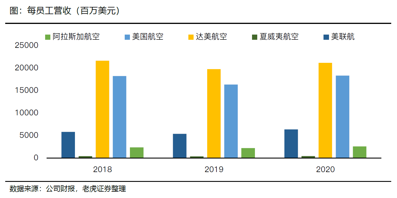 員工方面的負擔也是航空公司重要考量。從每個員工的平均營收來看,達美航空和美聯航也遠遠優於美國航空。