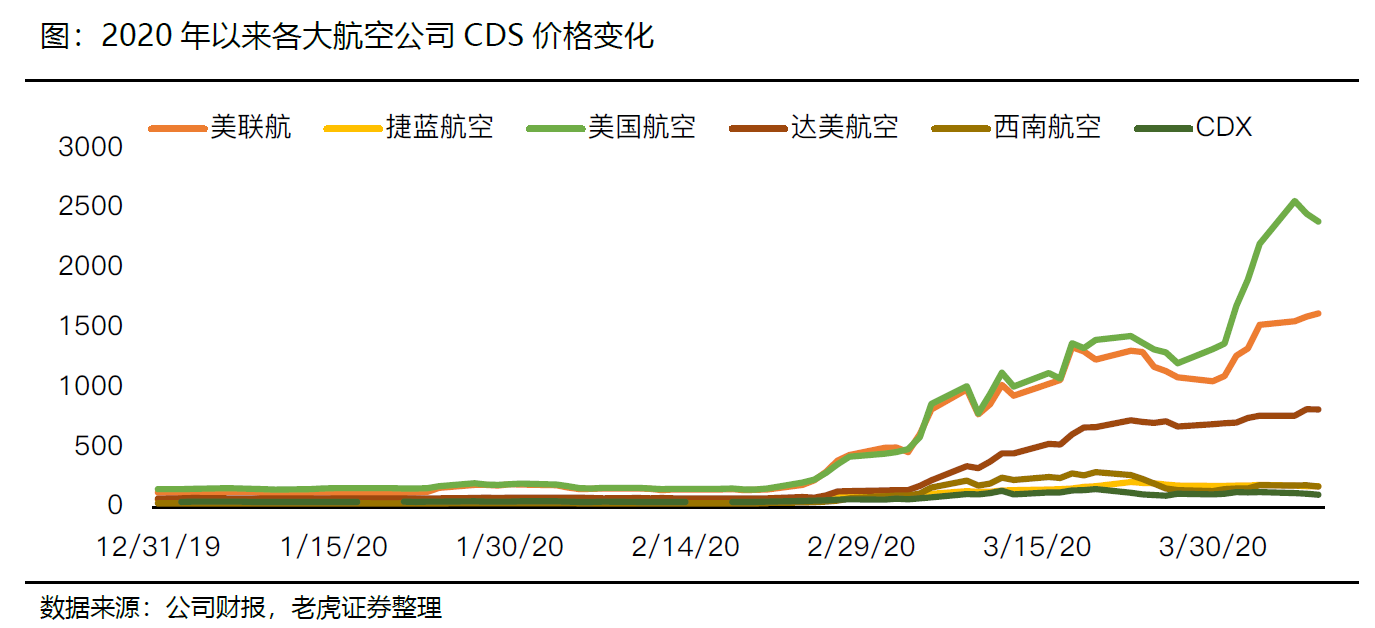從各大航空公司的CDS價格變化來看,美國航空、聯合航空和達美航空在國內疫情爆發的後期,也就是海外疫情爆發初期,開始上升。當美國疫情在三月中下旬快速發展時,負債率較高的美國航空一路領跑飆漲。航空公司的盈虧平衡運載率一般保持在75%-85%之間。近年來,美國航空AAL的盈虧平衡運載率稍高,而廉價航空公司運載平衡率一般較低。