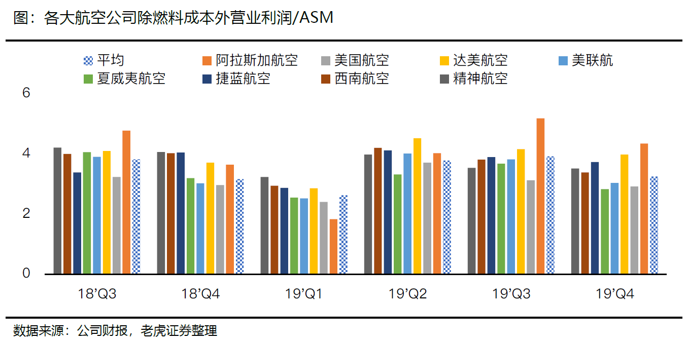 將大小航空公司的營業利潤直接對比恐怕很難看出他們的盈利能力,一般採用可用座位英里數(ASM)進行除權。通過橫向對比,小航司中的阿拉斯加航空表現出色,大航司中的達美航空更出色,而美國航空近幾個季度表現低迷。