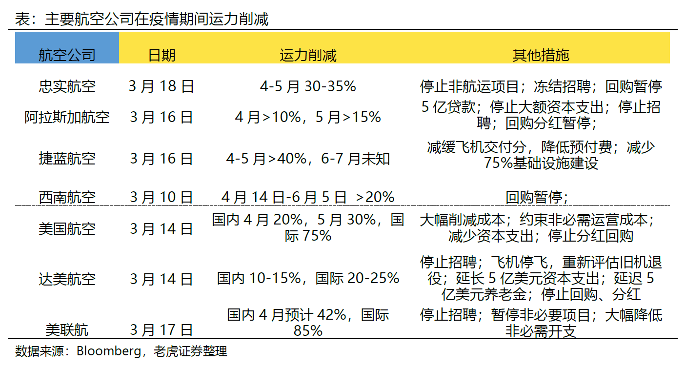 Covid-19疫情在美國的爆發,目前無法準確預測何時消失,航空需求重返市場也是一個懸而未決的問題。目前美國和歐洲幾乎所有的航空公司都削減運力至幾乎完全停擺。如果疫情有望在夏天消失,那今年H2的航空需求可能出現反彈。