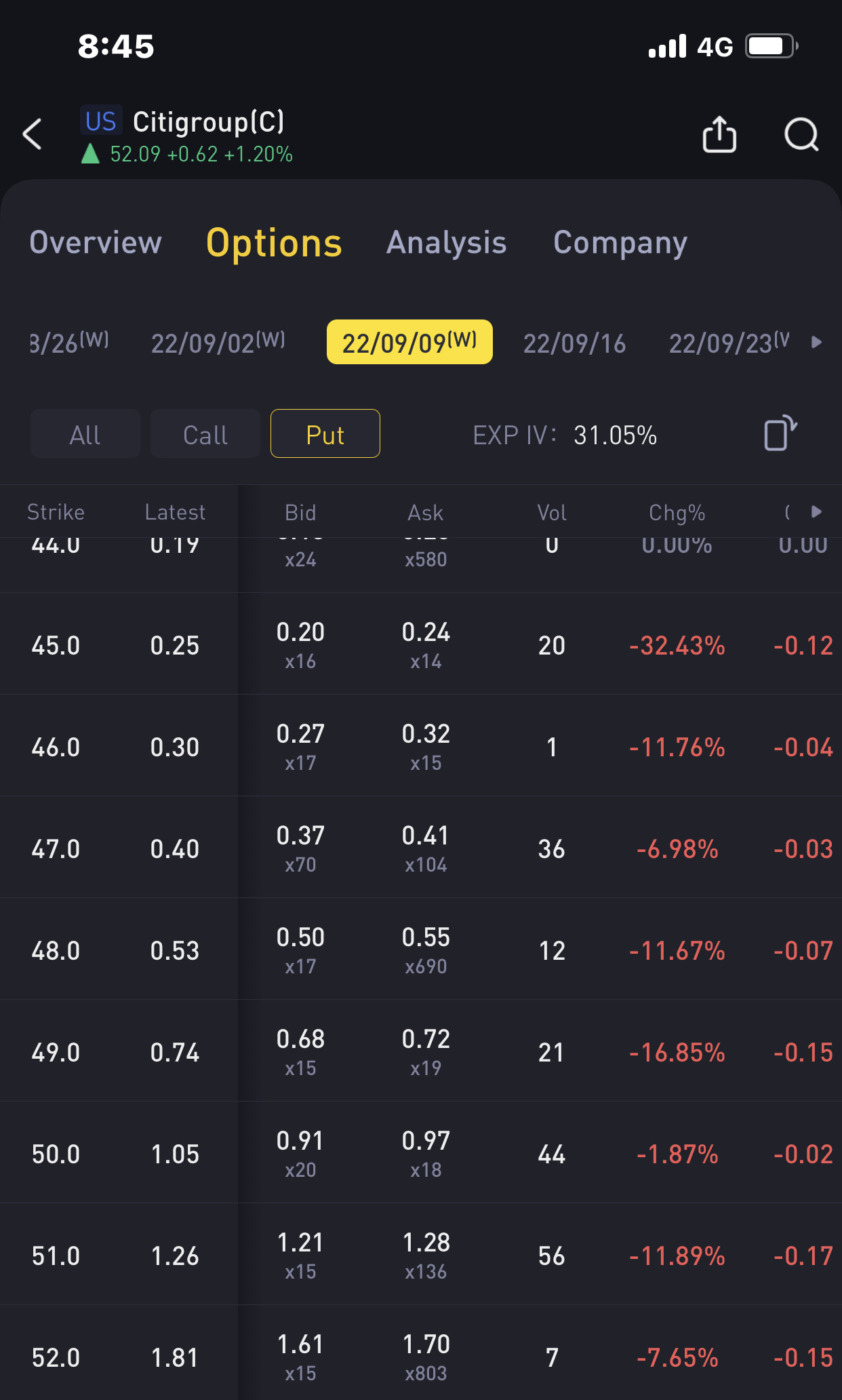Sell monthly put option Citibank at $48 earn1% premium 0.50