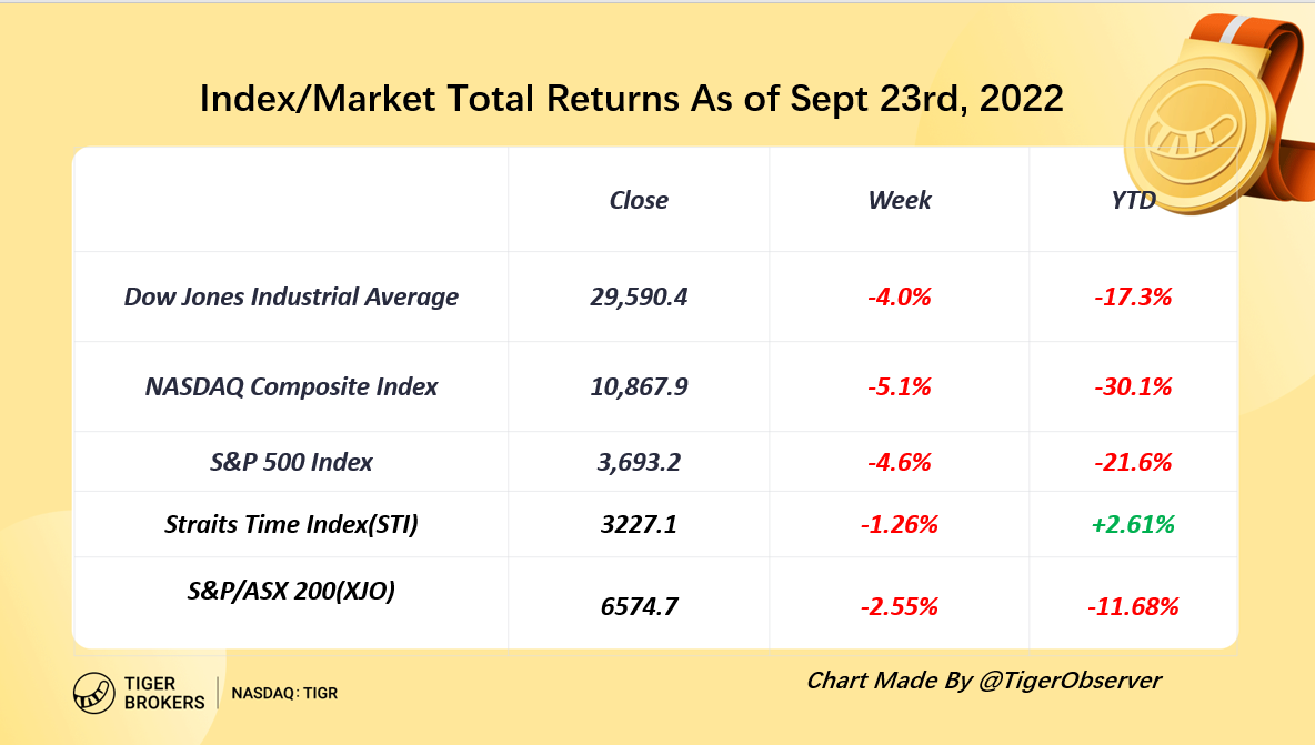 As of last Friday,$DJIA(.DJI)$ YTD is -17.3%, $NASDAQ(.IXIC)$ YTD is -30.1%, $S&P 500(.SPX)$ YTD is -21.6%. $Straits Times Index(STI.SI)$ and $S&P/ASX 200(XJO.AU)$‘s YTD performances are2.61% & -11.68% respectively.