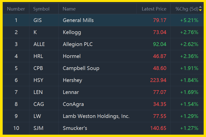 $General Mills(GIS)$ , $Kellogg(K)$ , $Allegion PLC(ALLE)$ , $Hormel(HRL)$ , $Campbell Soup(CPB)$ ,$Hershey(HSY)$ ,$Lennar(LEN)$ ,$ConAgra(CAG)$ , $Lamb Weston Holdings, Inc.(LW)$ , $Smucker's(SJM)$ .