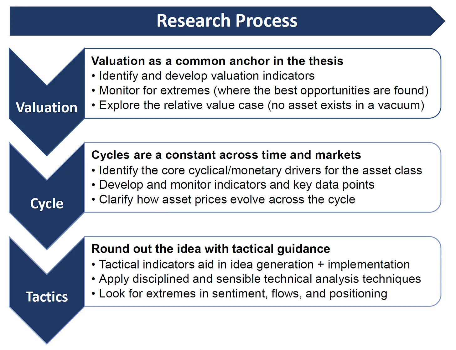 The table below outlines the major parts of the research process: typically the process involves starting with a valuation anchor to guide the strategic view, then bringing in macro/cycle/policy considerations to build out the medium-term view, and then rounding it out with tactical considerations (sentiment/technicals) to help finesse the timing aspect and raise conviction in the idea.