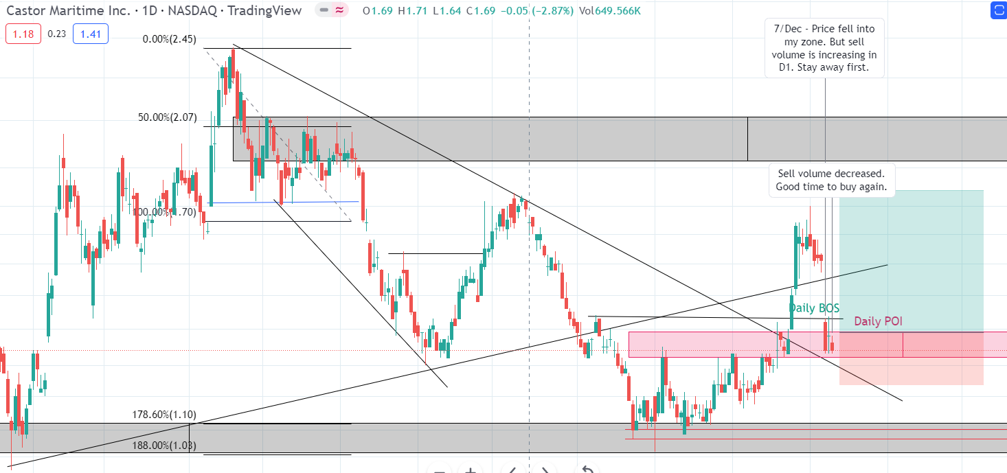 $Castor Maritime, Inc.(CTRM)$ $Castor Maritime, Inc.(CTRM)$ I sold off all my positions on 1/Dec/2022 when I saw that it is getting weak. Price then sharply dropped and fell into an interesting point of interest supported by a drop in selling pressure. I am considering buying the stock again.