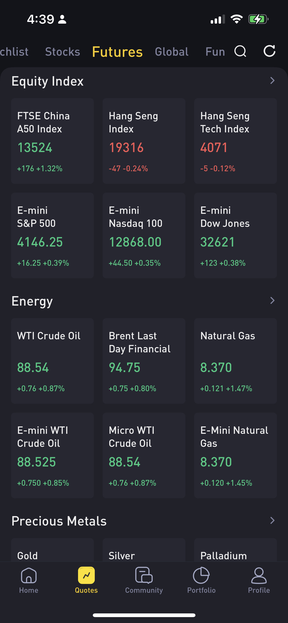 Best part of Quotes tab on Tiger Mobile app is the separation of Futures and Global tab. I can now check E-mini S&P 500 $E-mini S&P 500 - main 2212(ESmain)$and Nasdaq futures$E-mini Nasdaq 100 - main 2212(NQmain)$before the start and during the trading day and see how the market direction is likely to turn out.