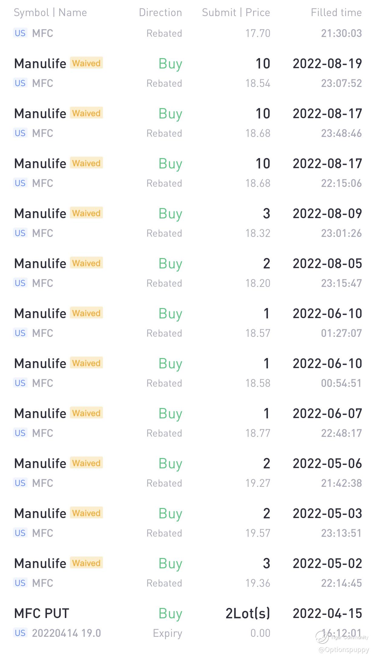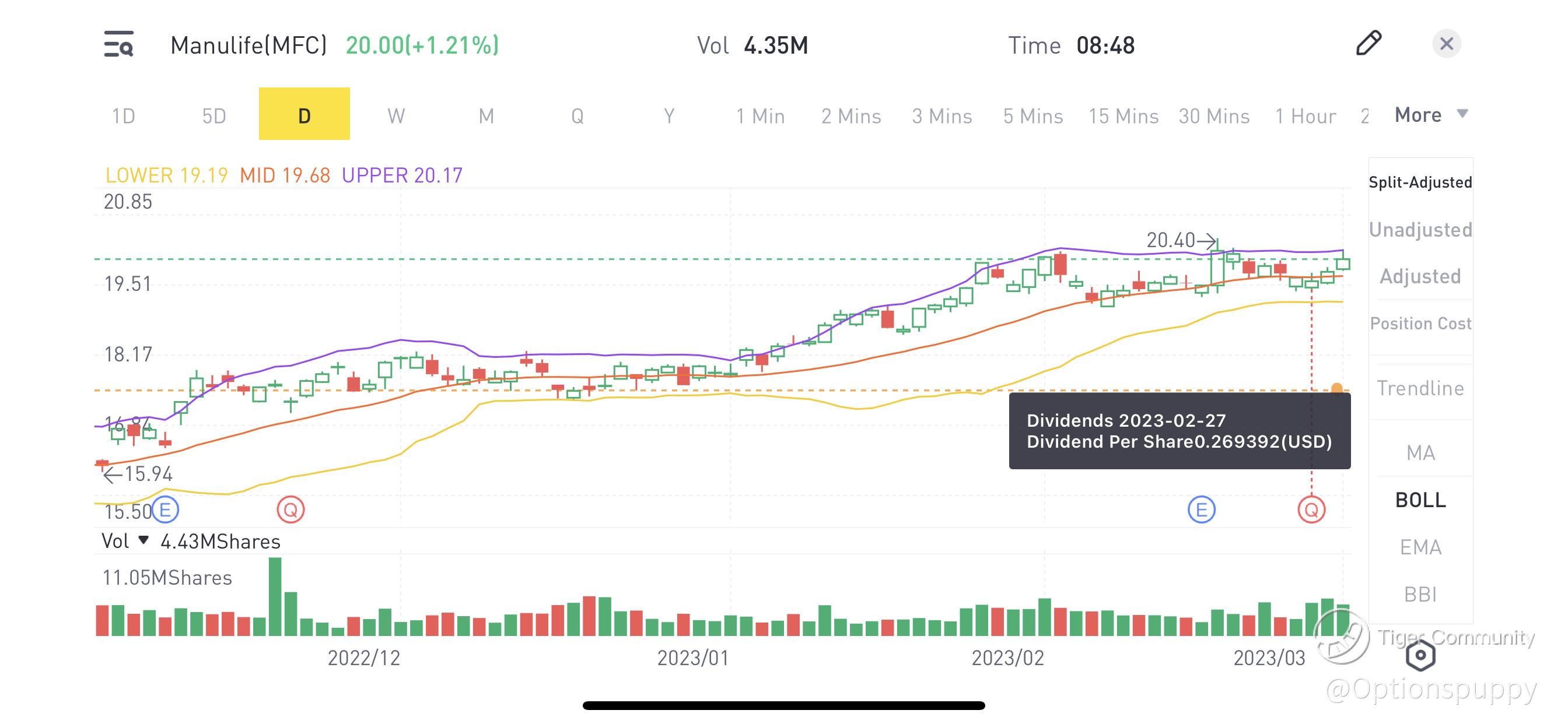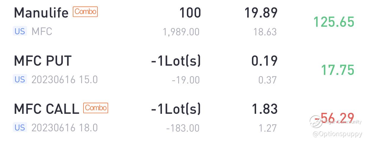 $Manulife(MFC)$ gives dividend of $1.12 per yearor 0.28 every 3 months . Selling the call options dated 3 to 6 months allow the user to the call premium and also the dividend.