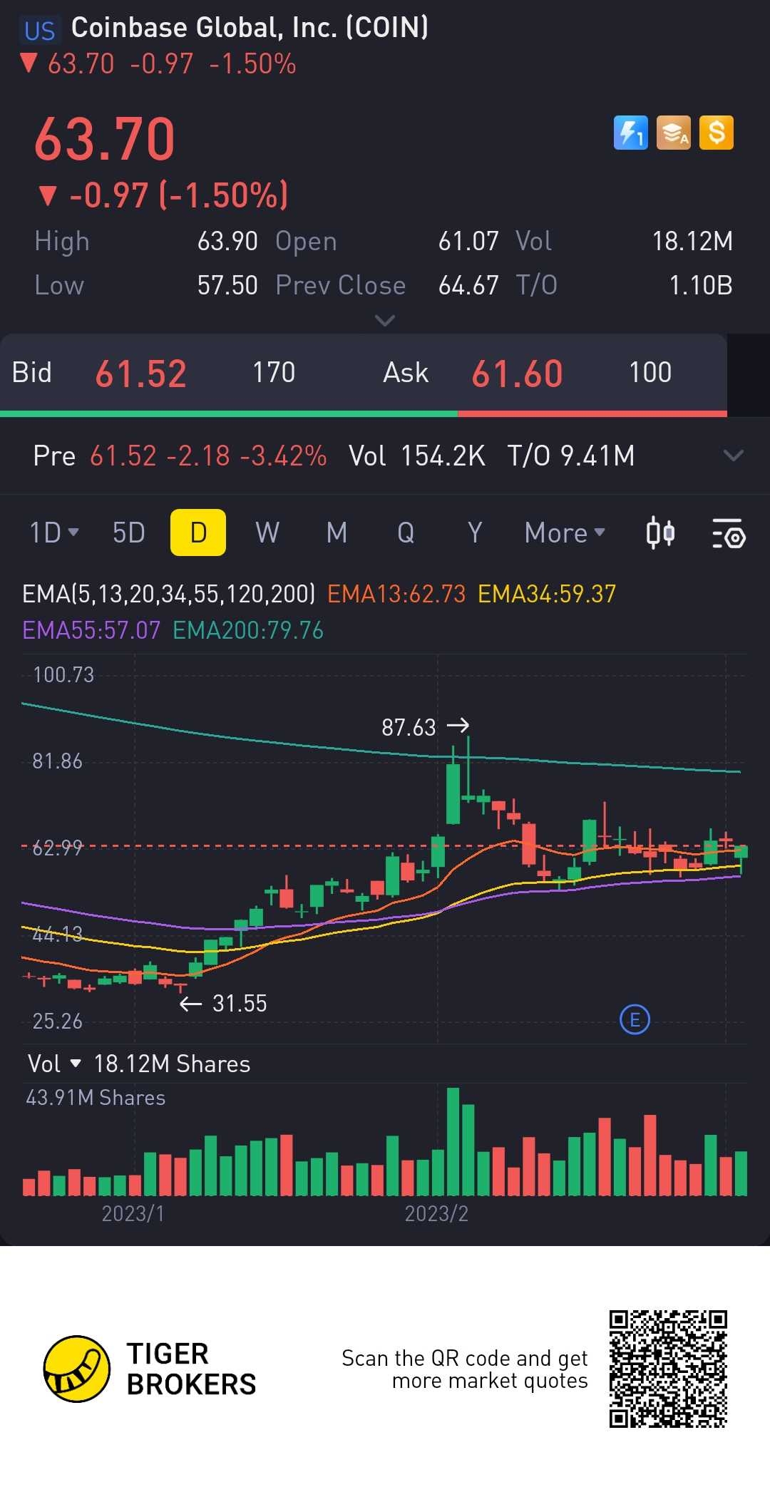 Coinbase Global, Inc. (COIN) share price falled due to Sivergate facing financial trouble. Coinbase cut ties with Silvergate and its share price bounced off EMA in yesterday trading session. Possible of moving higher, bullish for now.