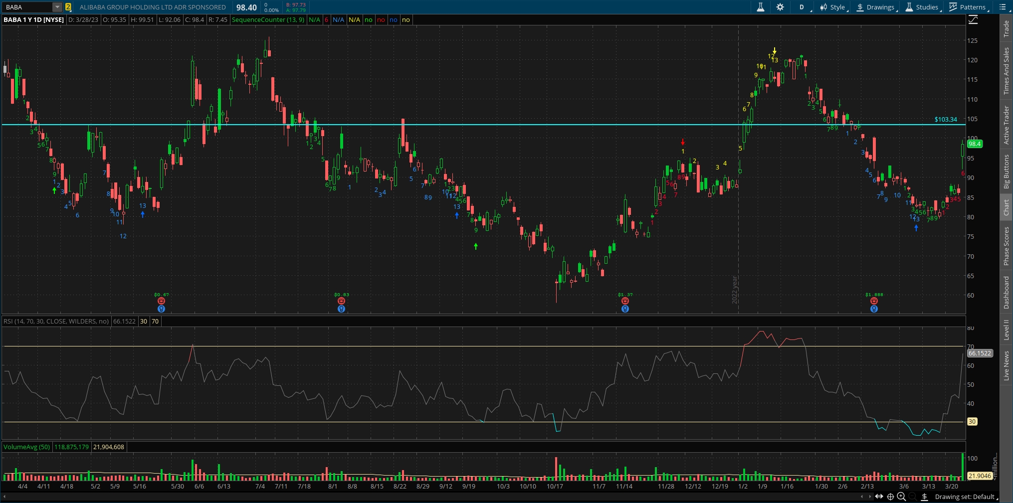 Based on technical analysis, BABA's relative strength index (RSI) on the day chart is currently at 66 and will likely go into the overbought region soon. The next resistance level is around 103, which suggests that if the stock is unable to stay above 103, it could experience a minor pullback. Therefore, I will consider purchasing Put Options at 103 or 104 expiring next week$BABA 20230331 103.0 PUT$ $BABA 20230331 104.0 PUT$ . However, I will make sure to keep my positions small and take profits quickly