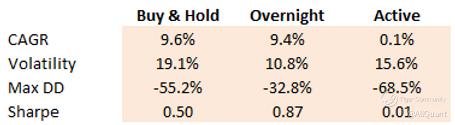 The results are pretty evident. The Overnight strategy is the one driving the gains over time delivering a Compound Annual Growth Rate (CAGR) of 9.4%. It also outperforms in terms of risk as its profile shows lower volatility and drawdown. The Active Hour strategy, on the other hand, gave a flat performance over this close to 30-year period.